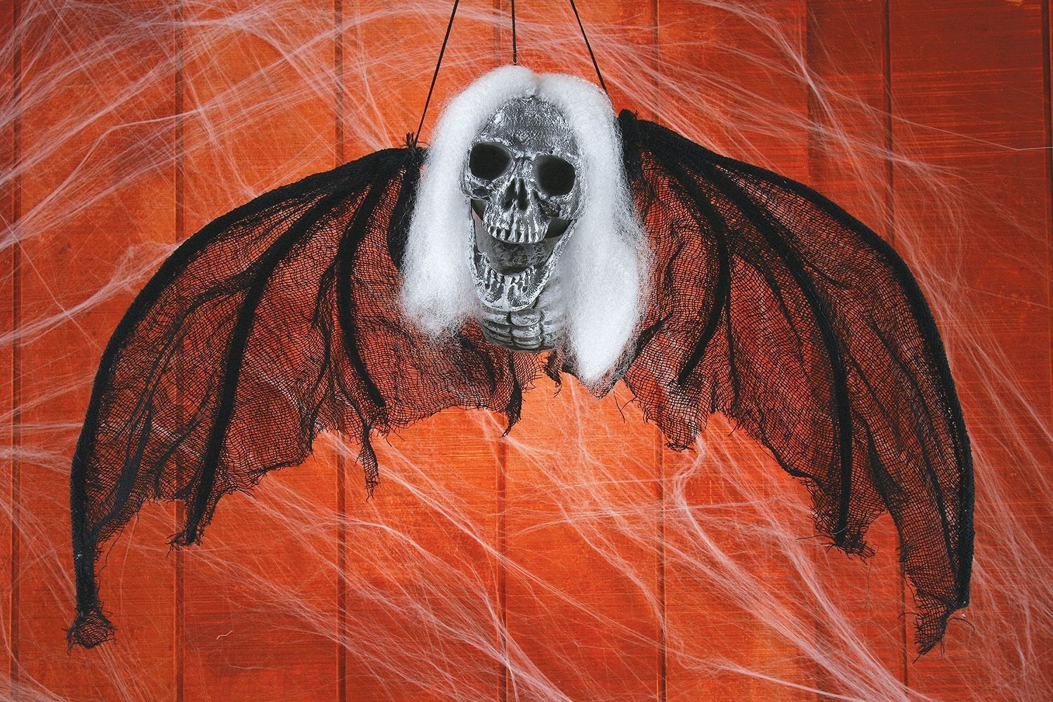Волосатый подвесной демон представляет собой серебряный череп с открытой челюстью, к которой прикреплены белые искусственные волосы, а также огромные черные сетчатые крылья, размах которых достигает 152 см. Эту фигуру можно подвесить за черные нитки. Идеально для Хэллоуина, Пятницы 13 и подобных мероприятий.