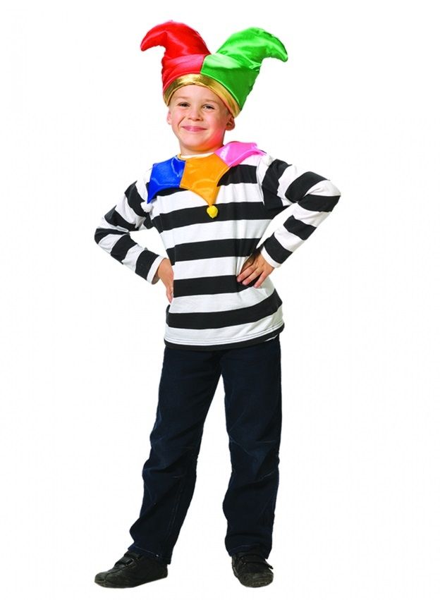 Детский комплект Клоуна включает в себя яркую цветную шапочку красного и зеленого цветов, с золотистой резинкой. Шапочка набита синтепоном для сохранения формы. Также в комплект входит яркий цветной воротник с маленькими помпонами.