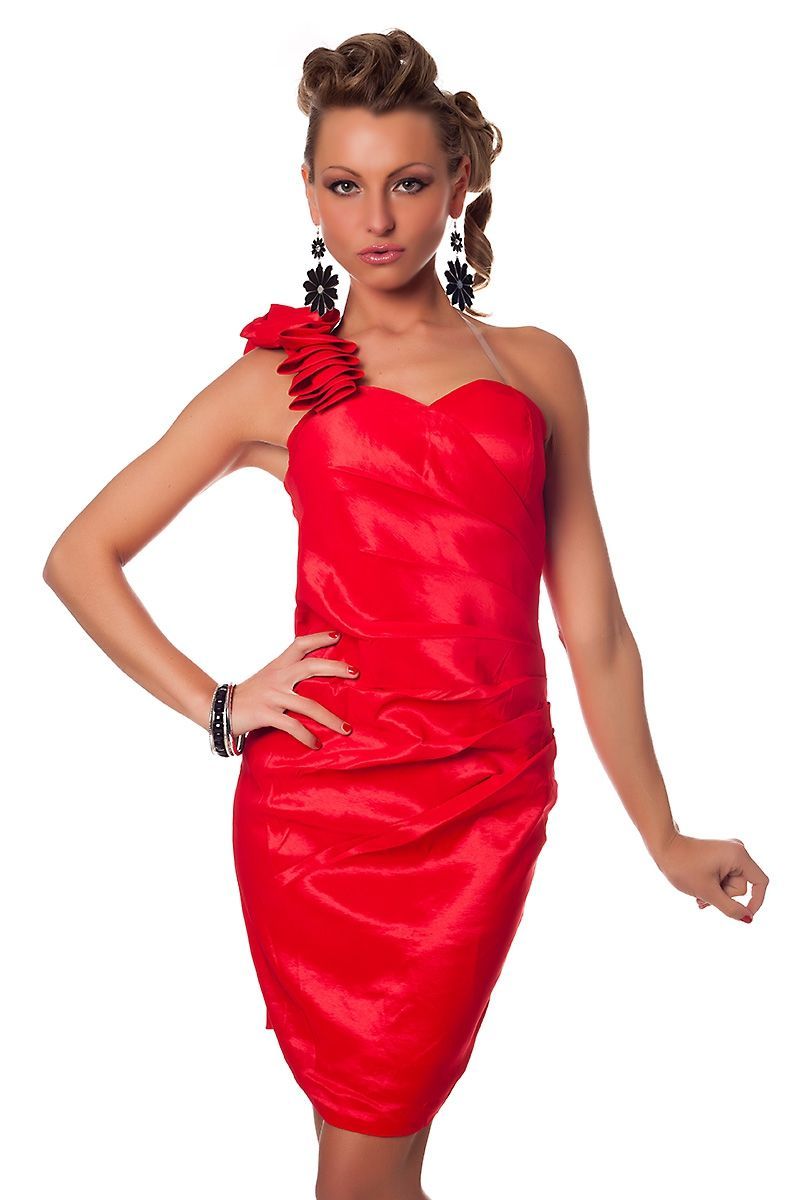 Красное коктейльное платье - это элегантное платье-футляр с одной объемной лямкой со сборками. По всему платью собраны декоративные складочки. Сзади имеется молния. Верхняя часть спины и одно плечо полностью открыто.