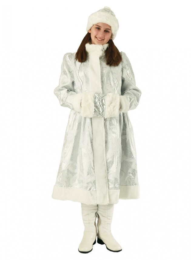 Костюм внучки Снегурочки включает в себя шубку из серебряной парчи с изящными узорами и искусственной меховой отделкой белого цвета, шапочку с меховым отворотом, а также муфту из парчи на шнурках, которая также отделана искусственной меховой отделкой.
