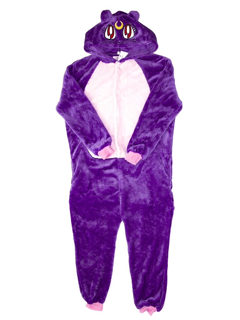 Детская пижама Кигуруми Кошечка Сейлор Мун - яркая фиолетовая пижама с розовой вставкой на грудке. Костюм выполнен из теплого, мягкого и приятного на ощупь материала. Пижама с длинными рукавами на резиночках. Капюшон кигуруми выполнен в виде мордочки кошечки и украшен перевернутым месяцем. Спереди застегивается при помощи маленьких пуговиц.