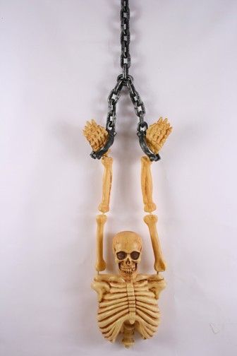 Туловище скелета в цепях выполнено в желтоватых оттенках, цепи выполнены в металлическом цвете. Эта подвесная фигурка представляет собой туловище скелета с поднятыми руками, за которые он подвешен.