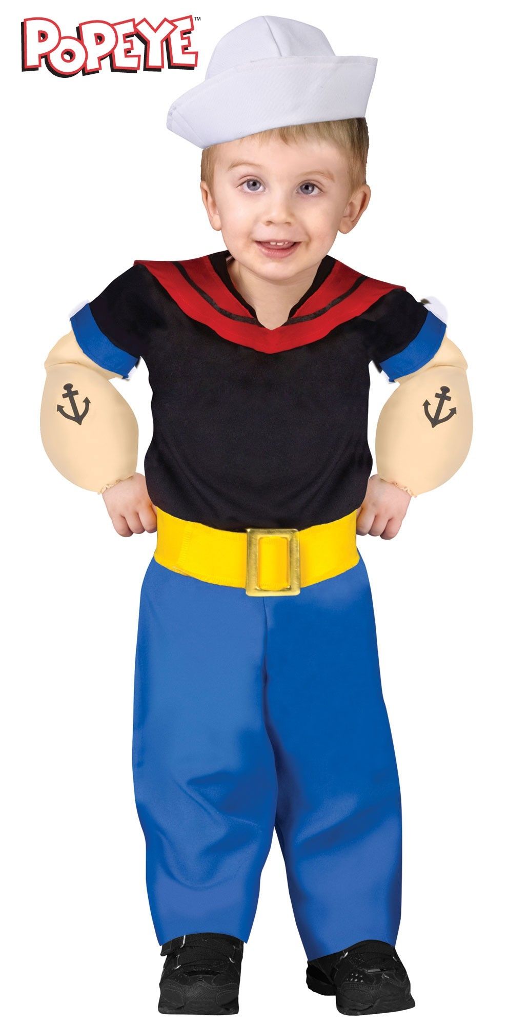 Детский костюм моряка Попайя - это забавный костюм для малышей известного американского героя комиксов и мультфильмов. Костюм включает в себя черную рубашку с красным воротничком, синие штаны с желтым ярким поясом, белую шляпу моряка, а также накладные мышцы на руки, на которых изображены якоря в виде наколки.