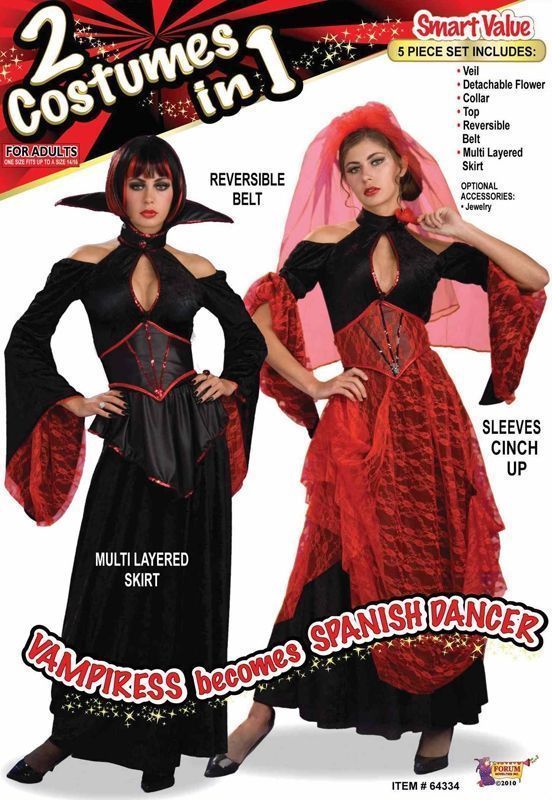 Забавный костюм вампирши и танцовщицы включает в себя вуаль, топ, многослойную юбку, пояс и съёмный цветок. Купив такой костюм вы покупаете два костюма в одном, ведь вывернув наизнанку костюм вампирши вы получите костюм танцовщицы и на карнавальном вечере вы можете легко менять костюмы в каком-нибудь укромном месте. Все будут удивлены тому что за короткое время вы воплотились совсем в другой образ.