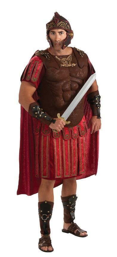 Костюм Римского Центуриона включает в себя красную тунику до колена с прикрепленными коричневыми доспехами с рельефом мышц, а также коричневый шлем.