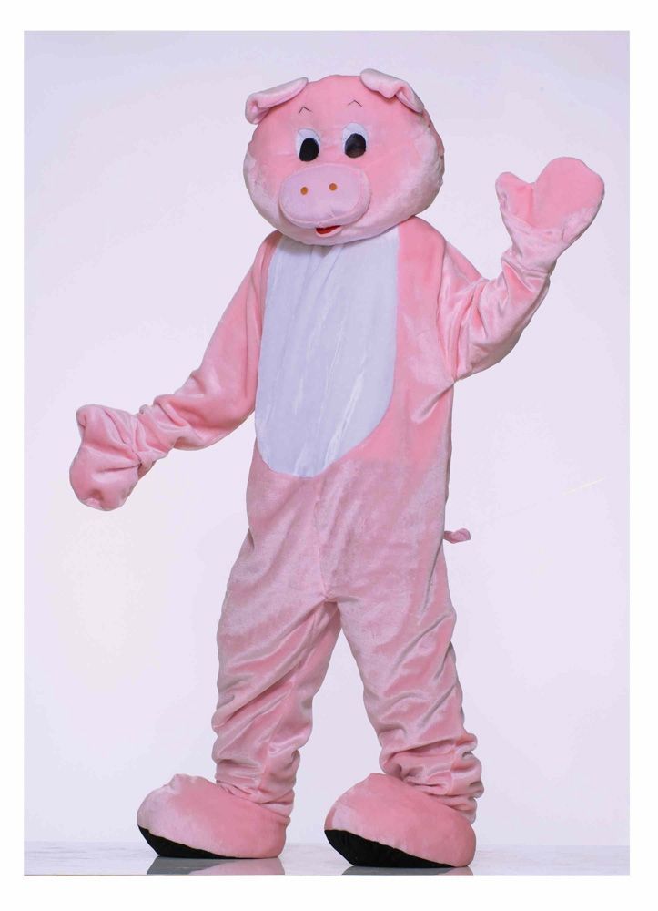 Костюм-талисман Свинка выполнен из мягкого приятного материала розового цвета. В комплект костюма входит комбинезон с белой грудкой и маленьким хвостиком сзади, мягкая обувь, перчатки и большая голова с милой мордочкой свинки.