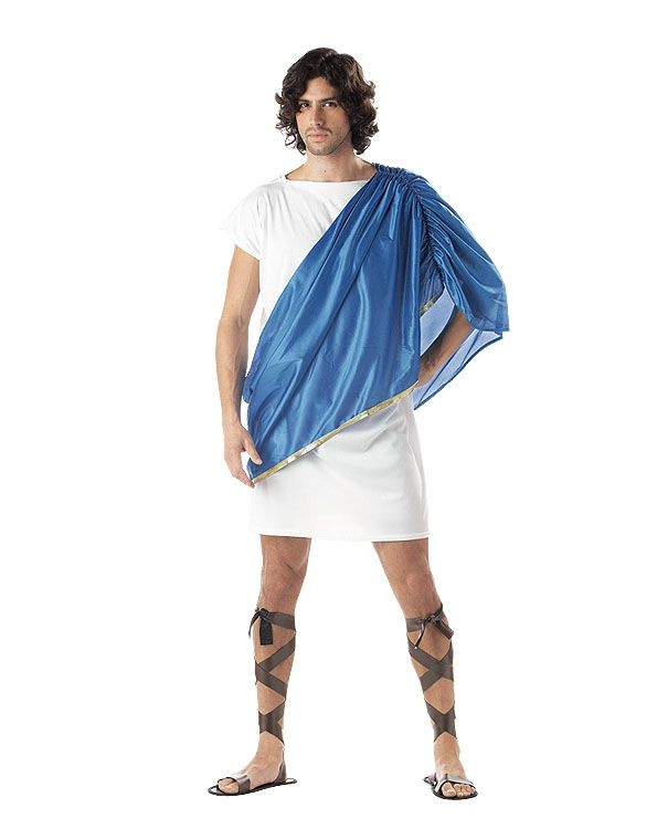 Мужская тога состоит из белой туники и голубой пелерины на плечо. К костюму в можете подобрать обувь, головной убор и другие аксессуары для дополнения образа. Такой наряд станет прекрасным выбором для тематических вечеринок, выступлений, маскарадов и карнавалов.