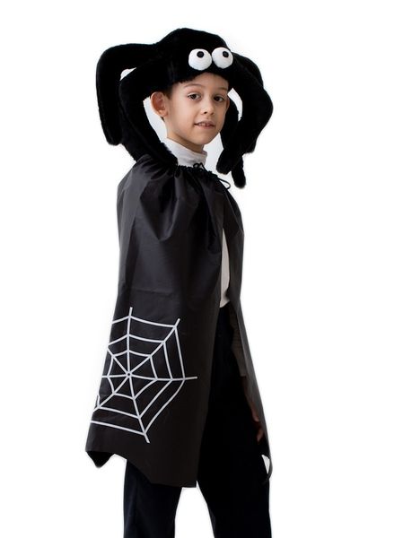 Костюм паучка детский - черный костюм, включающий в себя головной убор в виде паучка с большими белыми глазами и большими лапами. Также в комплект входит черный плащ на завязочках с принтом в виде белой паутины.