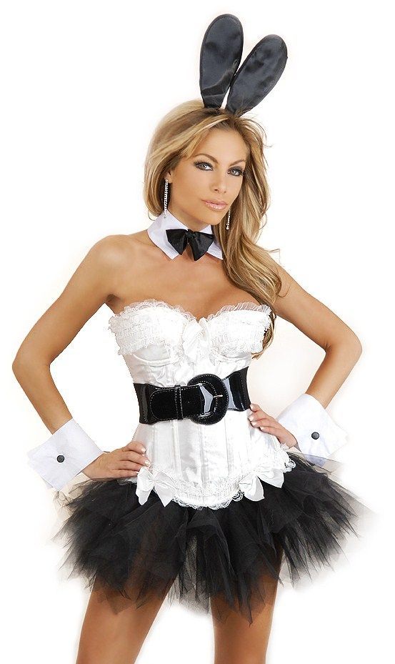 Корсетный костюм милого кролика включает в себя белоснежный корсет с задней шнуровкой, корсет украшен бантиками и кружевами. К корсету прилагается черный пояс, черная пышная пачка из многослойного сетчатого материала, галстук-бабочку, белые манжеты, черные ушки на ободке и соответствующие трусики.