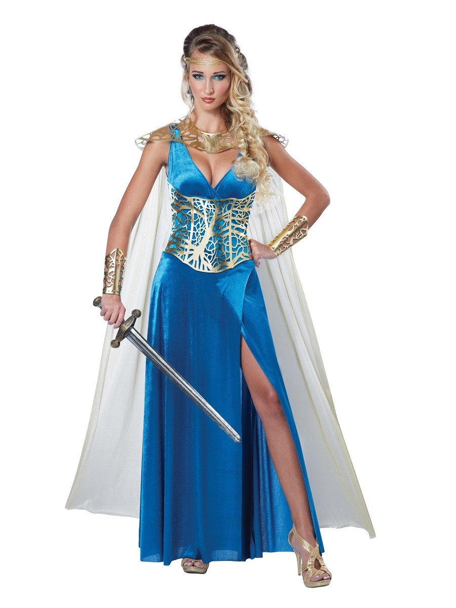 Костюм великолепной королевы воинов включает в себя синее длинное платье с глубоким декольте и высоким разрезом, ажурный золотистый корсет, два браслета, белую накидку с ажурным воротником и тиару.