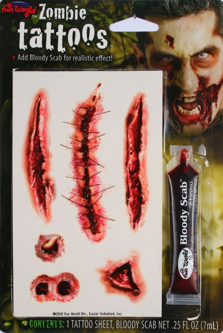 Набор накладных порезов прекрасно дополнит образы зомби и прочих аналогичных персонажей. В комплекте: накладные порезы и кровавый скраб.