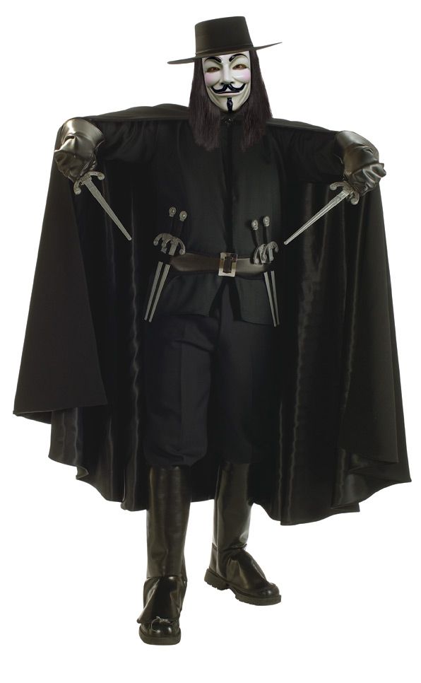 Костюм Вендетты V For Vendetta - это черный костюм одного из главных героев фильма "V — значит вендетта". В комплект костюма входит черная рубашка и брюки. Также его дополняют высокие черные голенища, прямая шляпа, длинный черный плащ, ремень, перчатки, 6 кинжалов и маска Гая Фокса.
