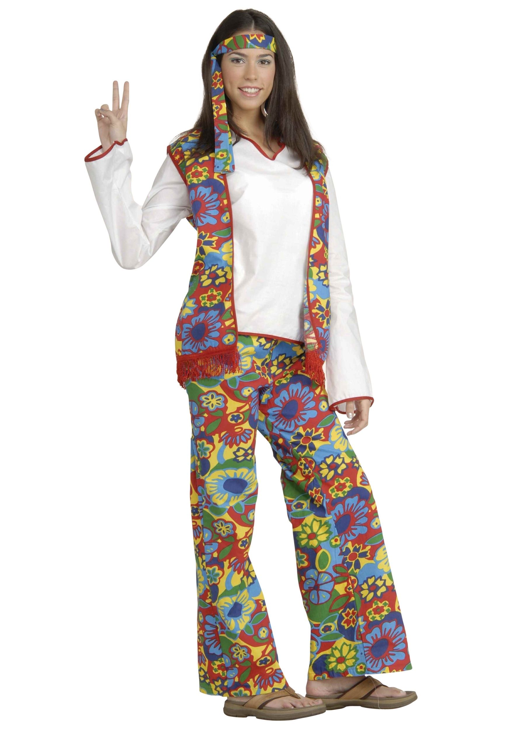 Взрослый карнавальный костюм яркой девушки-хиппи. Этот костюм отлично подойдет для любой вечеринки, будь то карнавал или просто тематический вечер. Благодаря ярким цветам вы будете обязательно замечены. В комплект карнавального костюма яркой девушки-хиппи входят штаны, жилетка и повязка.