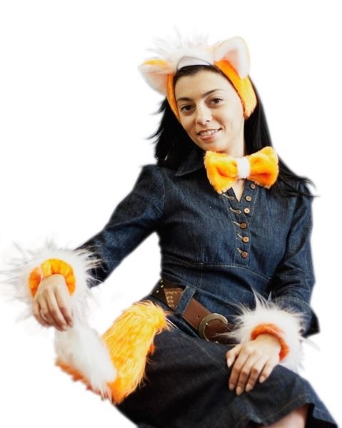 Набор Лисички выполнен из мехового материала оранжевого цвета. В комплект входит повязка с небольшими ушками и белой опушкой, оранжевая бабочка на шею, меховые нарукавники и рыжий хвостик лисички.