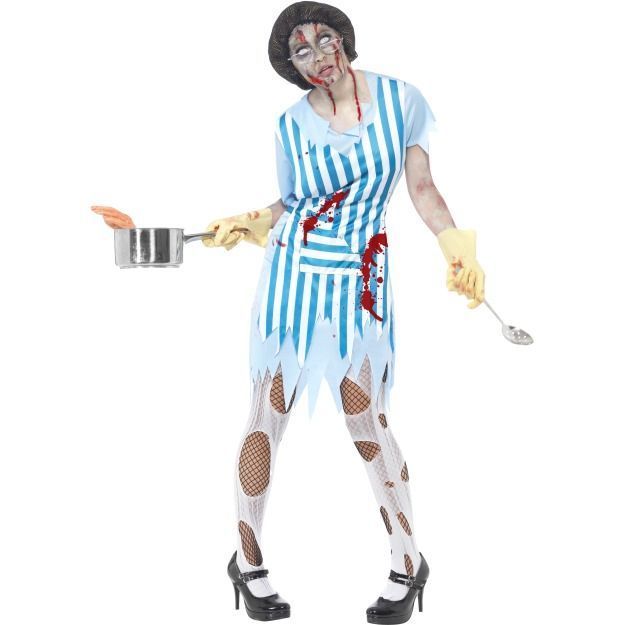 Костюм готовящей зомби включает в себя платье и сетку для волос. Такой "милый" наряд станет прекрасным выбором для вечеринки в честь Хэллоуина, Пятницы 13 и подобных праздников. Если вы хотите чтобы ваш образ был законченным и весьма жутким, то вы можете подобрать различные подходящие аксессуары.