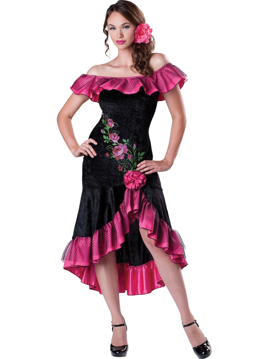 Костюм танцовщицы фламенко подойдёт вам, если вы любите различного рода танцы и вам милы ценители танцовщиц. Красивое чёрное платье с розовыми оборками и розами - это и есть прекрасный костюм танцовщицы фламенко.