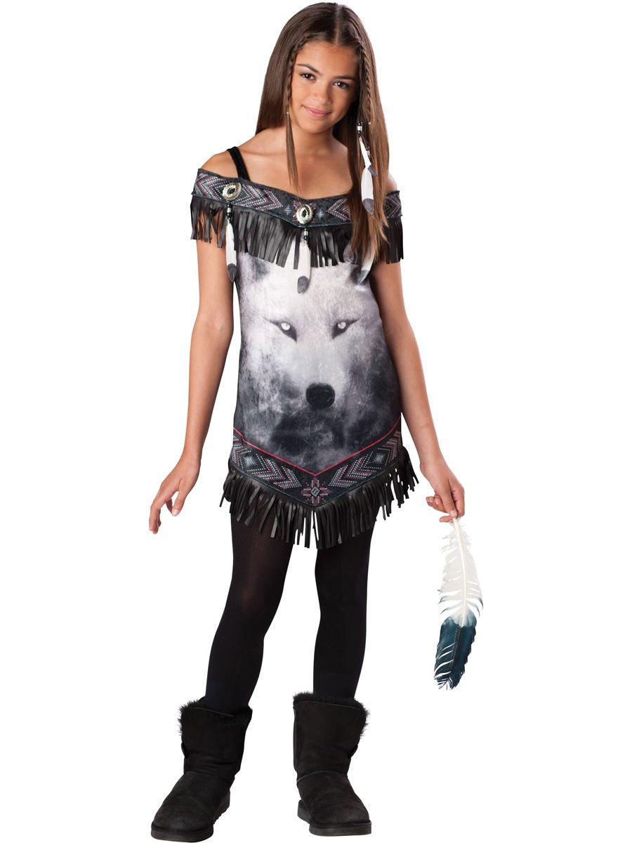 Костюм спирита детский - это красивое платье на лямочках с бахромой и принтом в виде головы волка, заколки для волос и черных леггинсов. В таком наряде вы сможете вызвать любых духов, только будьте осторожны, ведь не все они приходят к нам с добрыми намерениями.