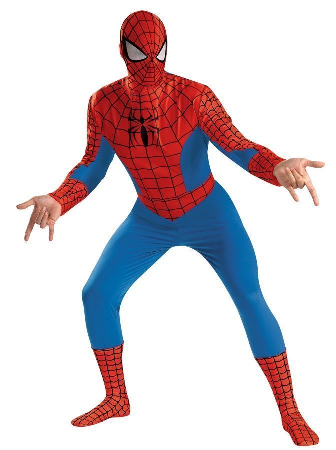 Стандартный костюм Спайдермена выполнен в красно-синем цвете. В костюм входит комбинезон с изображением паука на груди, обувь и тканевая маска с сетчатыми отверстиями для глаз. Для того чтобы завершить свой образ, вы можете подобрать перчатки и оружие Человека Паука.