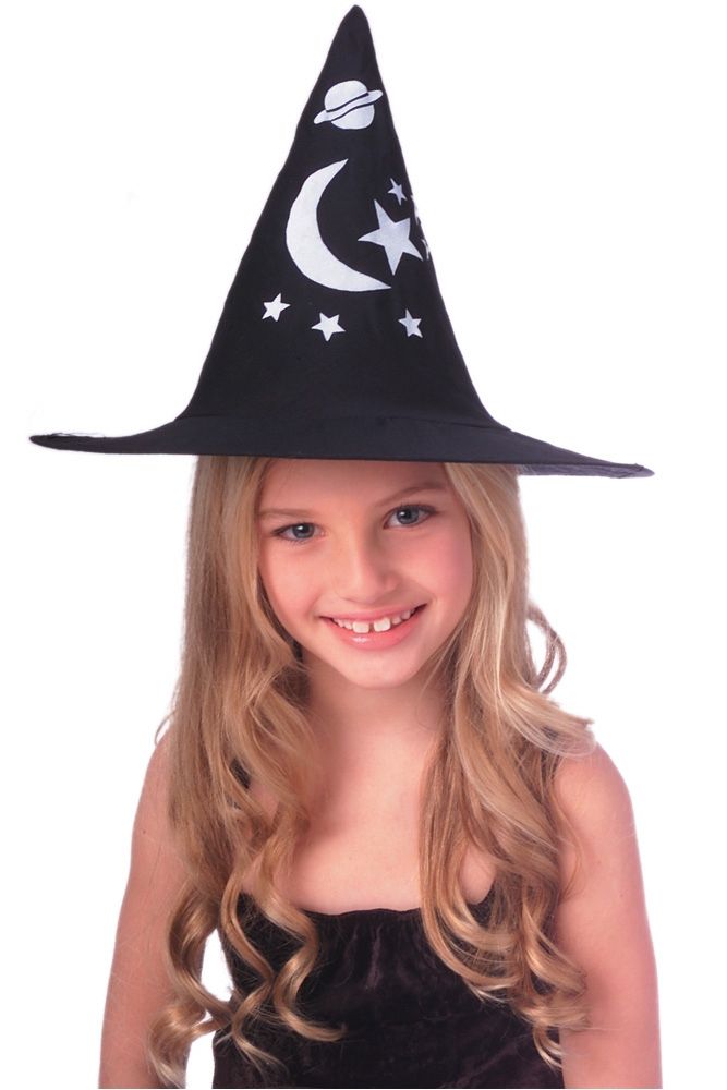 Детская тканевая шляпка ведьмы выполнена в черном цвете. Шляпа конусной формы с белым изображением месяца, звезд и планеты.