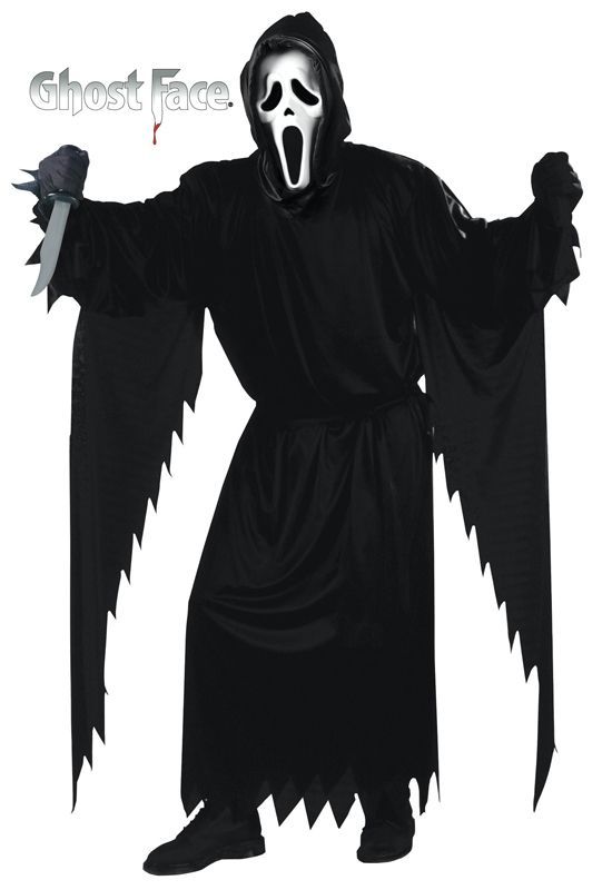 Костюм призрачного лица - это костюм всеми известного героя из фильма "Крик". В комплекте костюма имеется плащ чёрного цвета с капюшоном, пояс и конечно же, маска(нож не входит в комплект).