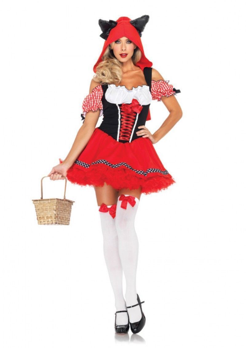 Костюм Красной Шапочки Волчицы представляет собой красно-черное платье в крестьянском стиле со шнуровкой спереди, к которому прикреплен красный капюшон с волчьими ушками. Чулки, корзинку и туфли вы можете приобрести у нас отдельно.