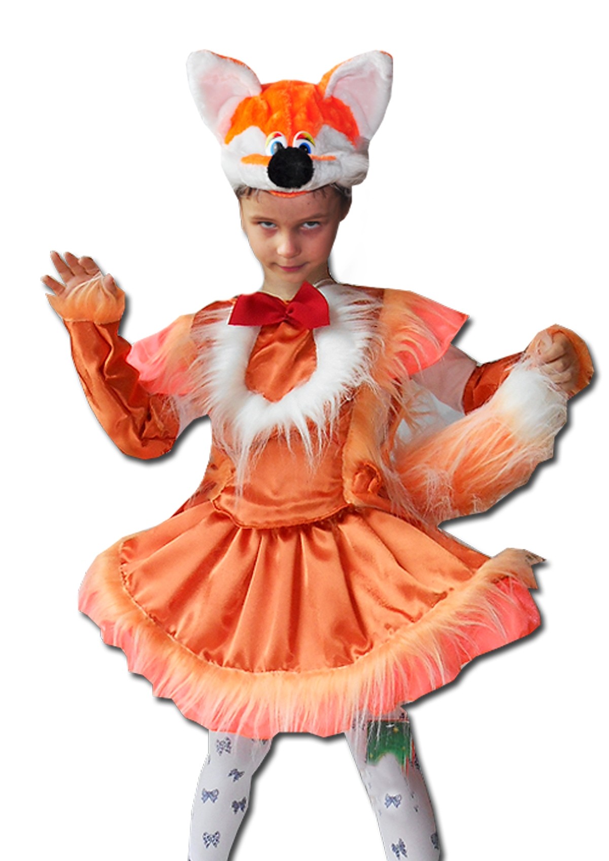 Детский костюм хитрой лисички - оранжевый яркий костюм, в комплект которого входит меховая шапочка-маска в виде мордочки лисички, жилет с меховой отделкой, пышная юбочка с меховой отделкой, пушистый рыжий хвост, гетры и перчатки без пальцев.