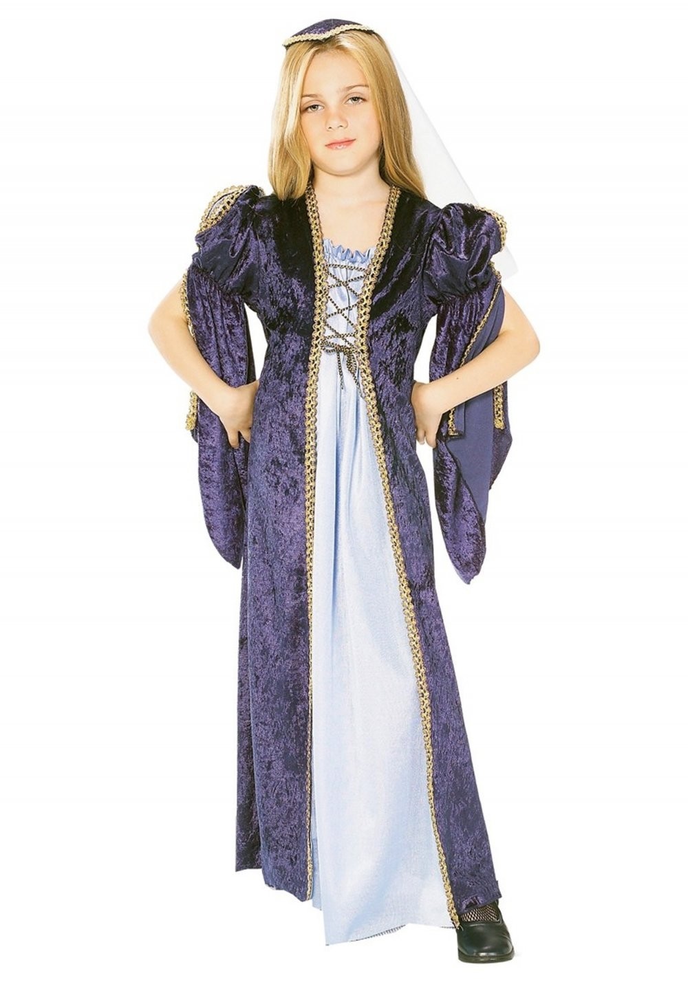 Костюм Джульетты детский для девочки выполнен в сиреневых тонах. Прелестная героиня трагедии Шекспира «Ромео и Джульетта». Детский костюм Джульетты включает в себя головной убор и платье.(Прочие аксессуары для дополнения образа вы также найдете в нашем каталоге).Рекомендации по уходу: Только чистка по месту загрязнения.