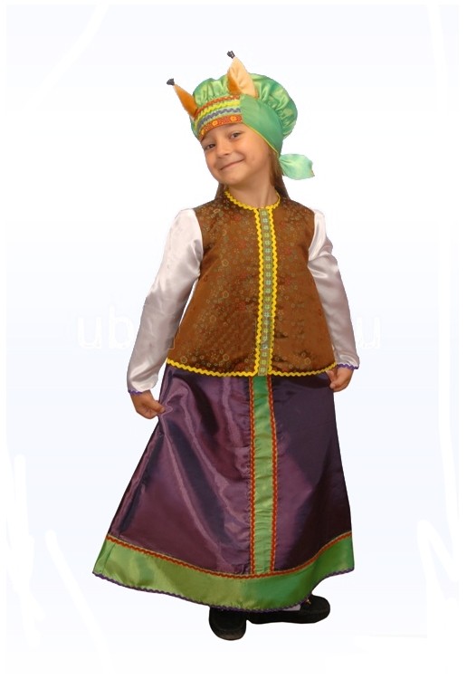 Детский костюм Белки-Стрелки включает в себя длинную фиолетовую юбку с зеленой отделкой, кафтан с цветочным узором и отделкой из желтой тесьмы, зеленый чепец с оранжевыми ушками белочки, а также бусы.