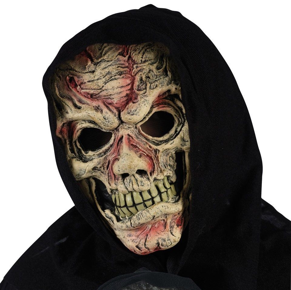 Маска зомби с ранами выполнена в желтоватых оттенках из латекса. На лице зомби есть множество рваных кровавых ран, но при этом его ехидная и кривая улыбка не сходит с лица. К маске прикреплён черный капюшон, также имеются сетчатые отверстия для глаз. Маска подойдёт для Хэллоуина и Пятницы 13.
