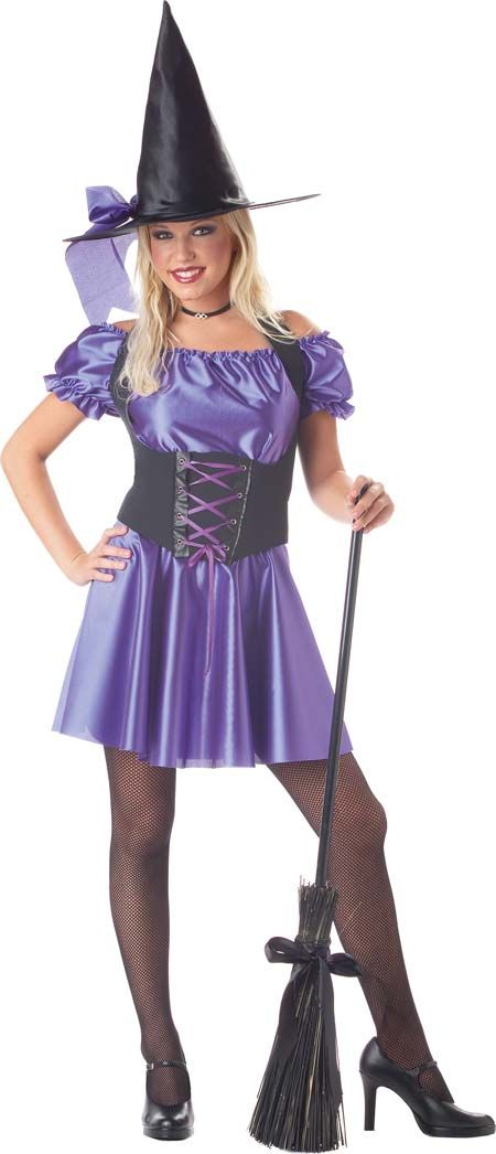 Костюм сказочной ведьмочки включает в себя сиреневое платье с корсетом и конусную шляпу с ленточкой. Метла в комплект не входит, но её можно приобрести отдельно и другие аксессуары, которые дополнят ваш образ.