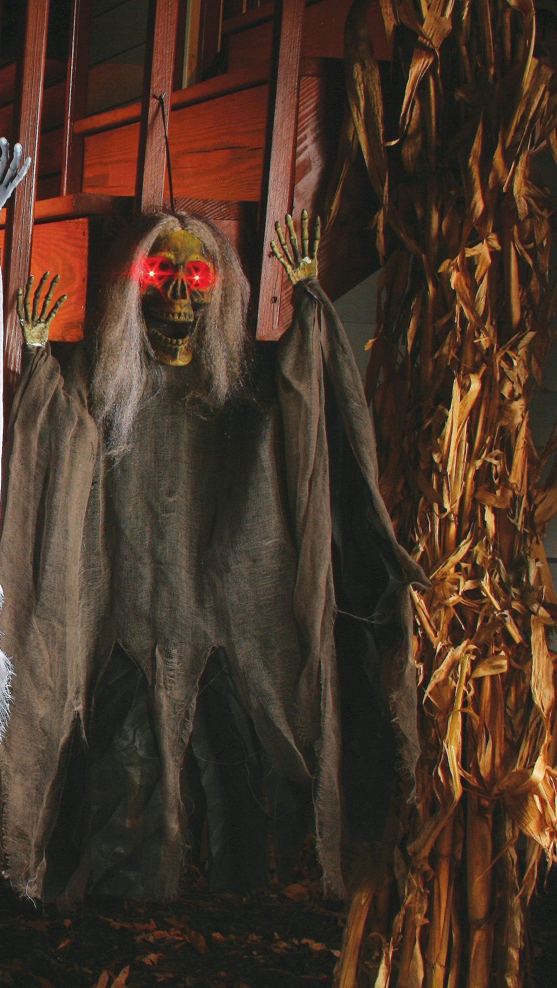 Подвесная смерть с серыми волосами - это декоративная жуткая фигура со светящимися красными глазами. Смерть с коричневым черепом и костлявыми руками, на ней длинный коричневый плащ и с черепа свисают серые волосы.