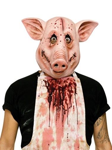 Маска бешеной свиньи выполнена из латексного материала розового цвета. Маска изображает мордочку свиньи с брызгами крови, и шрамами у рта. В маске круглые прорези для глаз.