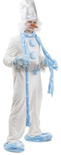 Костюм Снеговик состоит из комбинезона, шарфа, тапок, варежек, шапки-ведра, парика и носа-морковки. Снеговик один из немногих помощников Деда Мороза, чей костюм так же можно у нас купить.