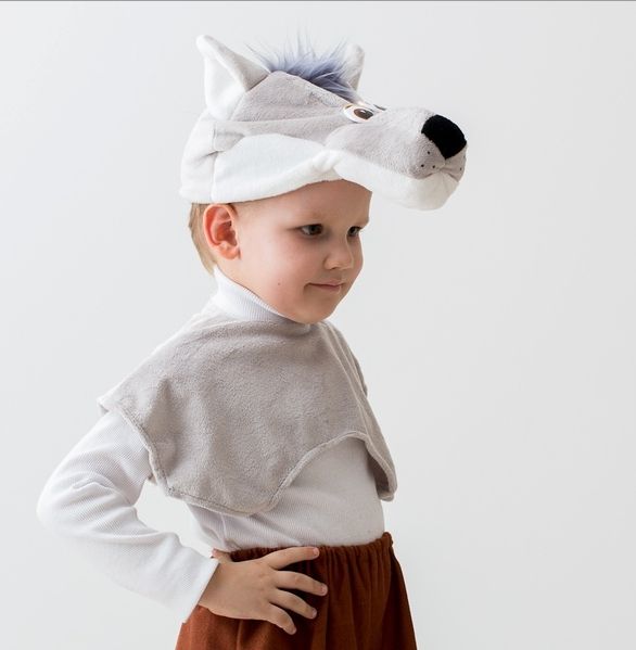 Комплект волчонка для детей выполнен из мягкого плюшевого материала серого цвета. В него входит шапочка-маска в виде мордочки волчонка, а также короткая накидка на липучке.