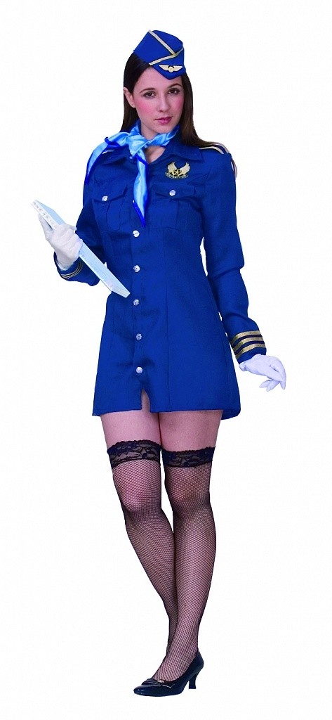 Костюм стюардессы синий - яркий костюм, который подойдет для тематических вечеринок и праздников. В комплект входит синее платье на пуговицах, синий головной убор, а также голубой шарфик на шею.