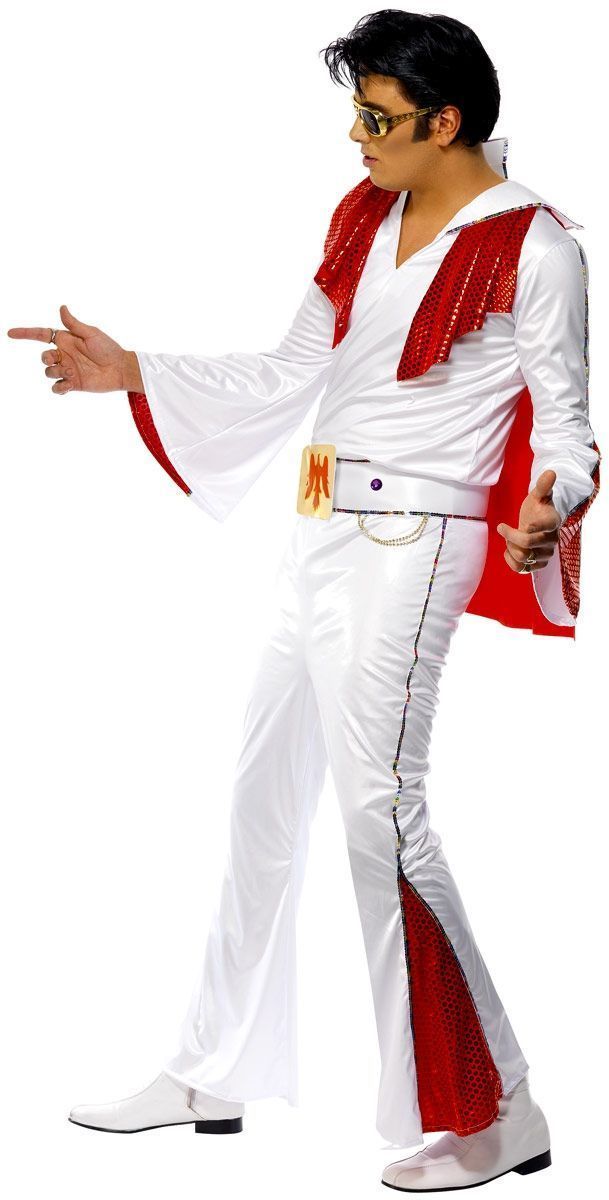 Костюм Элвиса прекрасно подойдёт для выступлений, танцевальных вечеринок, клубных мероприятий и других. Костюм выполнен в белом цвете с красными вставками. В комплект костюма входит рубашка, штаны с поясом и плащ. Парик и прочие аксессуары смогут дополнить ваш образ.
