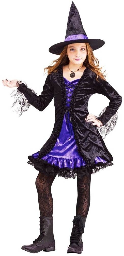Детский бархатный костюм ведьмочки включает в себя бархатное черно-фиолетовое платье с длинными рукавами. Платье с черной кружевной отделкой и декоративной шнуровкой на груди. Также в комплект входит высокая конусная шляпа, декорированная атласной фиолетовой лентой.