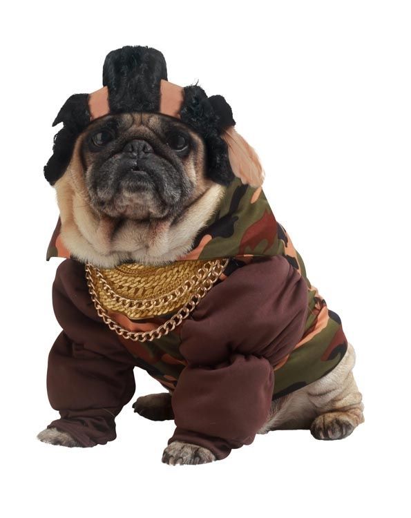Костюм для собаки Пит Буль включает в себя головной убор, объемный жилет и цепи на шею золотого цвета. Сделайте из своего питомца грозную собаку!