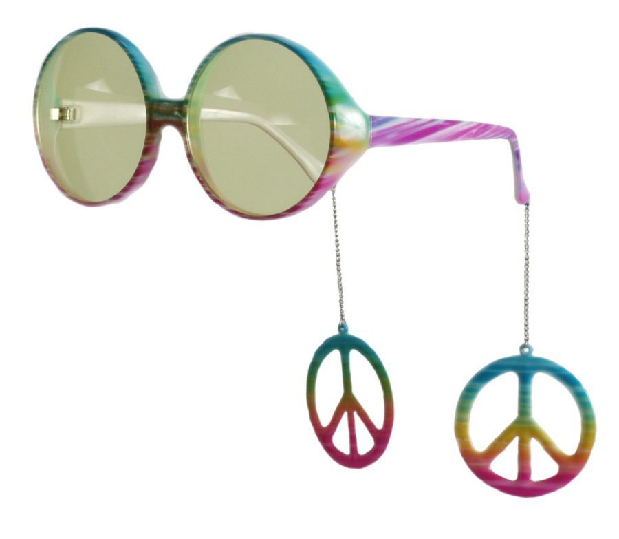 Мульти-очки хиппи выполнены в различных ярких цветах. Светлые стёкла, на заушниках болтаются значки хиппи. Такие очки подходят для детей и взрослых.