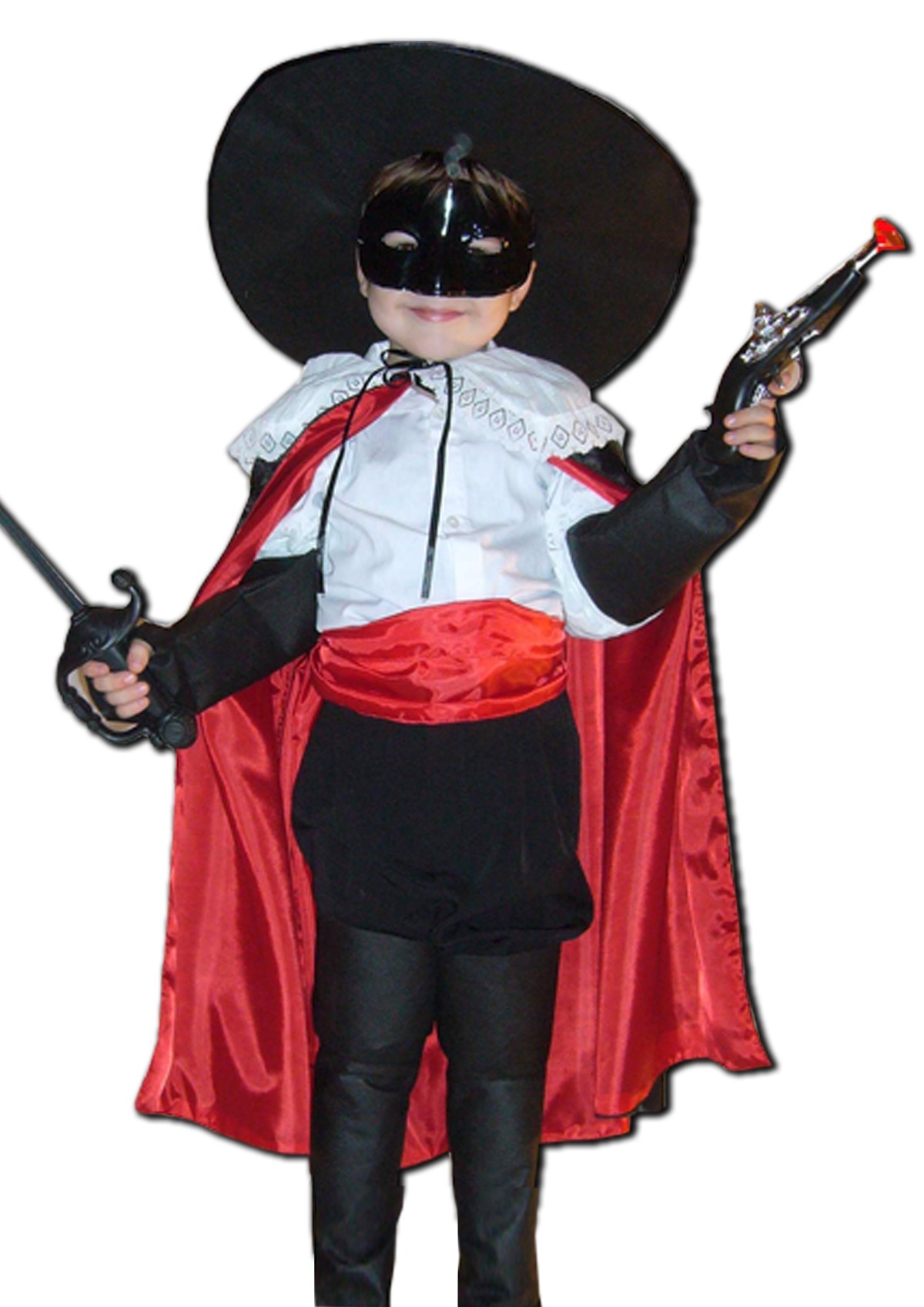 Костюм Зорро для детей подойдет для отважных мальчишек. Костюм идеален для детского утренника. Костюм включает в себя накидку-плащ с кружевными белым воротником, красный  пояс, черные перчатки без пальцев, накладки на обувь, а также незаменимые атрибуты Зорро - маску на глазу и шляпу с широкими полями.