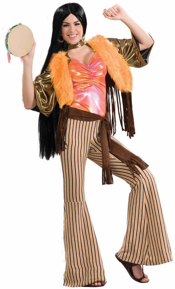 Женский костюм девушки 60-хх годов всенепременно полюбится тем, кто жить не может без музыки. В комплект костюма входят штаны клёш с поясом, топ и жилетка. Такой костюм вы сможете надеть на музыкальную вечеринку или же ретро концерт.