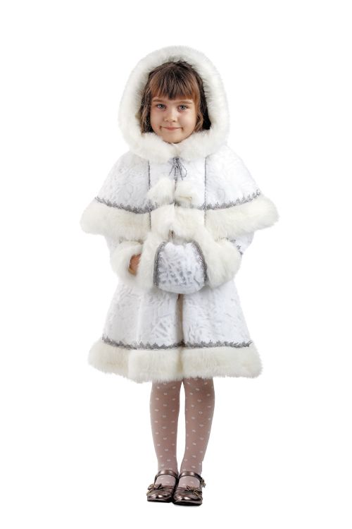 Костюм маленькой снегурочки выполнен из мягкого теплого материала. В комплект костюма входит платье с голубыми узорами и белой меховой отделкой, накидка с капюшоном на завязках и голубая муфточка с белым искусственным мехом.