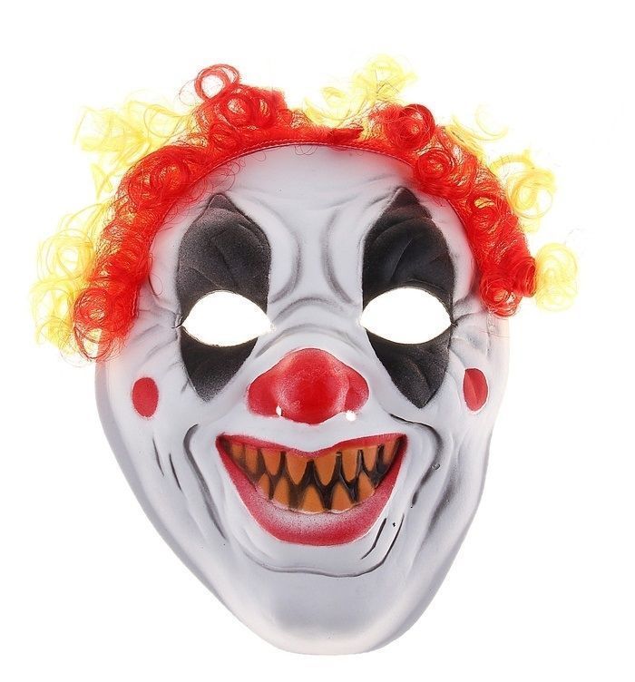 Маска очумевшего клоуна с красно-желтыми волосами и безобразными коричневыми зубами. Такой клоун совсем не доброжелательно относится к окружающим и явно не настроен смешить детей и взрослых. Маска изготовлена из мягкого пластика и имеет размер 18х23 см.