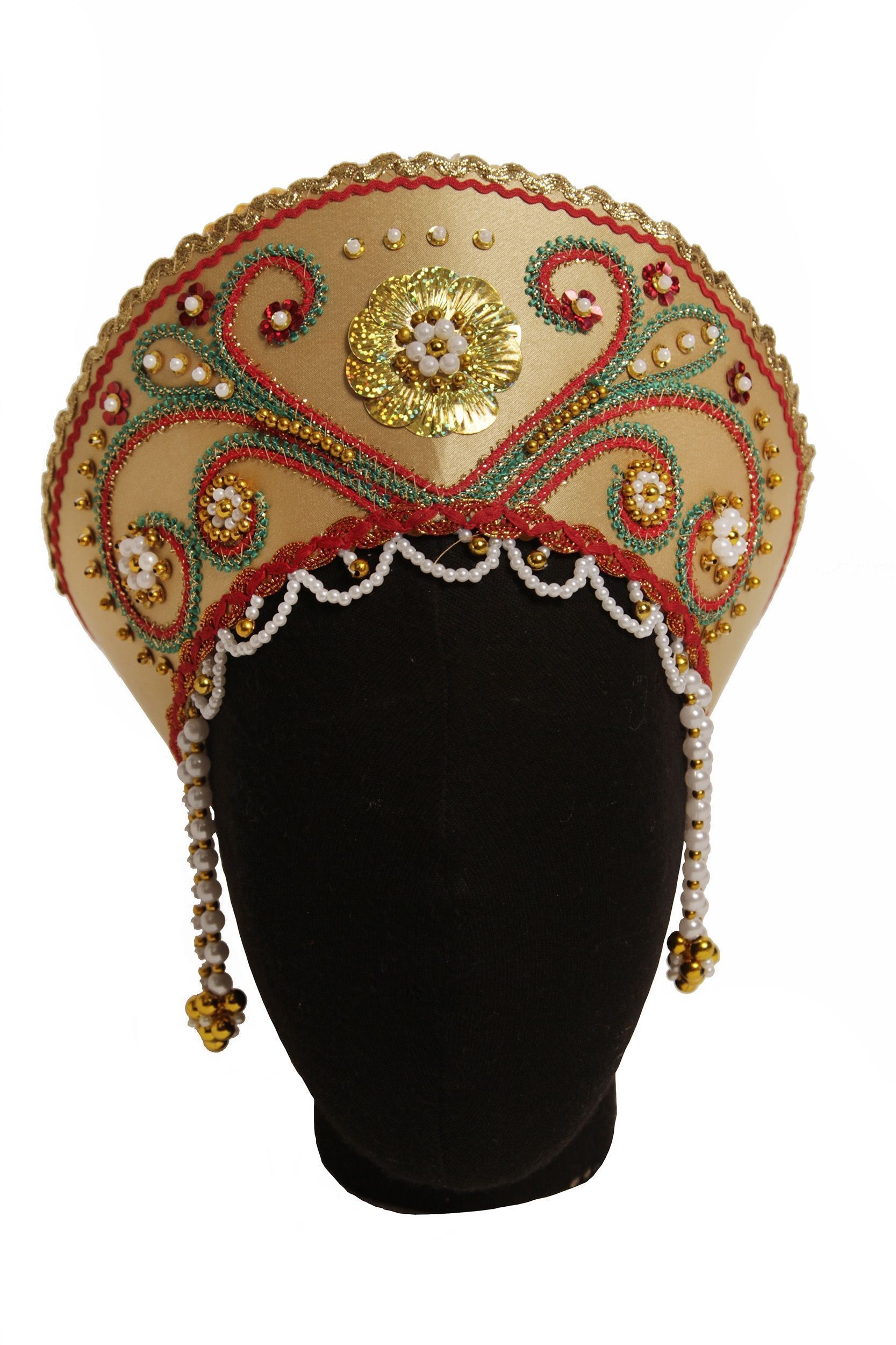 Золотистый круглый кокошник это прекрасный вариант для создания русского народного образа. Кокошник выполнен в золотистом цвете и украшен узорами из зеленой и красной тесьмы. Также его украшает декоративный цветок с бусинами.