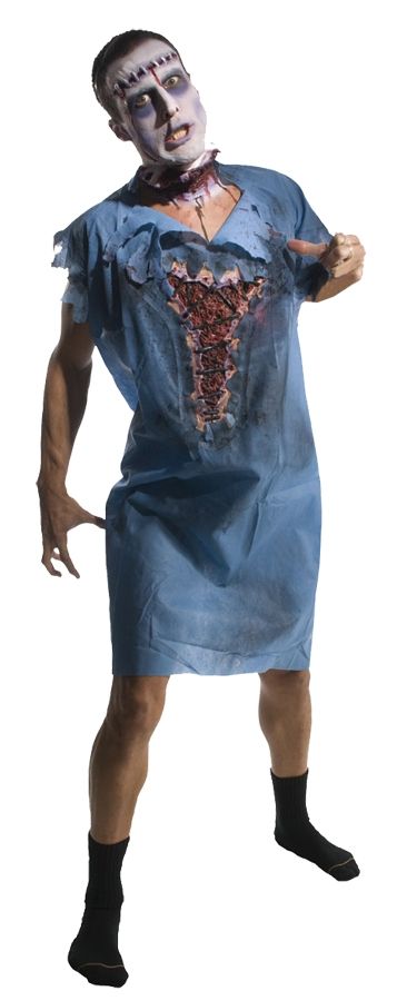 Костюм прооперированного зомби - это халат синего цвета, на котором имеется имитация разреза, за которым видна грубо зашитая рана. Подобрав к костюму макияж, накладные раны, вы создадите неповторимый образ для Хэллоуина, Пятницы 13 и других подобных вечеринок.