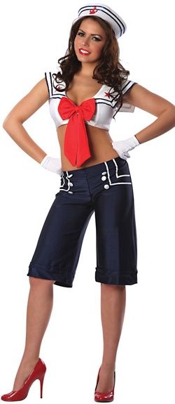 Костюм морячки Кракер Джек включает в себя темно-синие бриджи до колен, расклешенные книзу, короткий топ белого цвета с синими полосками и красным бантом спереди, а также белую морскую шапочку с полосками синего цвета. Для дополнения образа вы можете приобрести обувь, сумочку и прочие аксессуары.