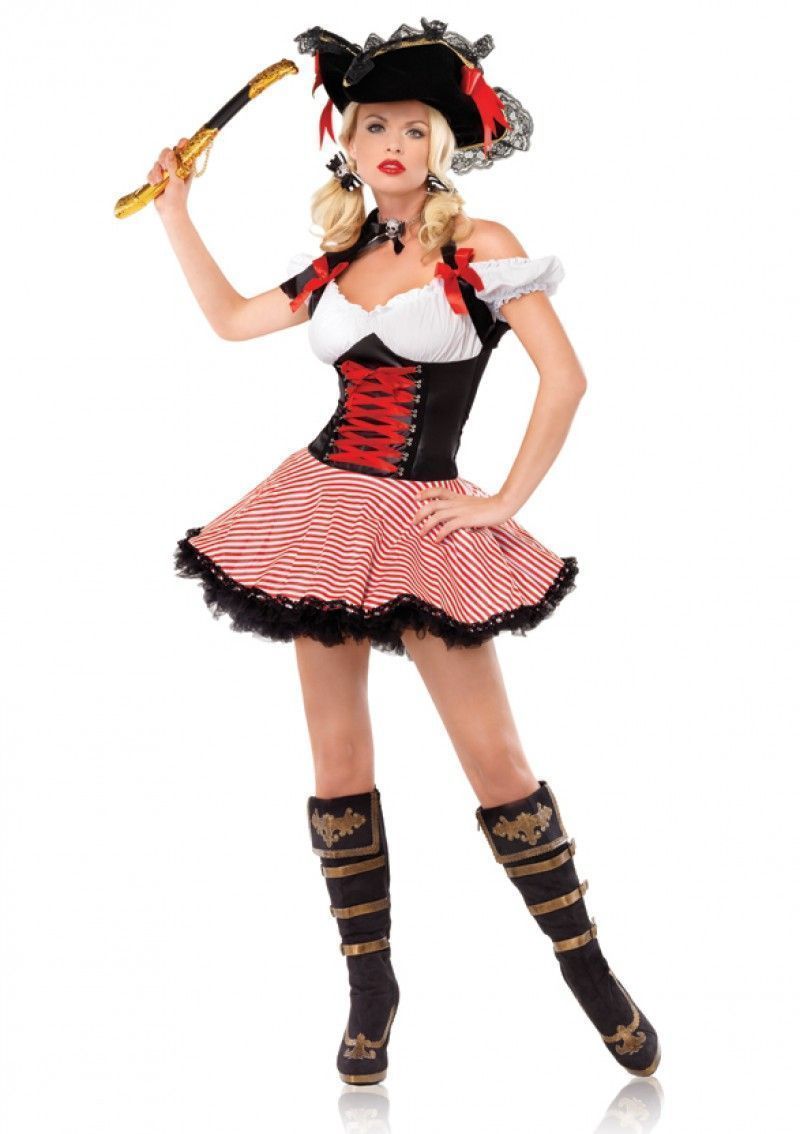 Черно-красный костюм пиратки включает в себя платье, спереди украшенной красной шнуровкой, черную повязку на глаз и кинжал.