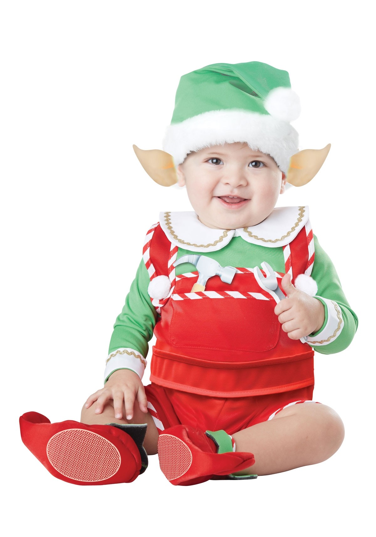 Костюм рождественского Эльфа для малышей - наряд милого помощника Санта Клауса. Костюм включает в себя зелено-красный комбинезон с белым воротничком и большим кармашком спереди, ботиночки с нескользящей подошвой и зеленый колпак с острыми ушами. Также в комплекте маленький гаечный ключ и молоток из пенопласта.