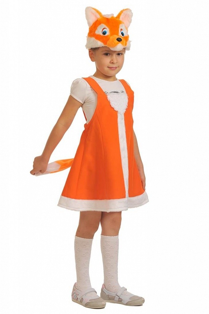 Детский костюм лисицы - яркий оранжевый костюм, который включает в себя платье чуть выше колена с меховой белой отделкой и пришитым рыжим хвостиком, а также шапочку-маску в виде мордочки лисички.