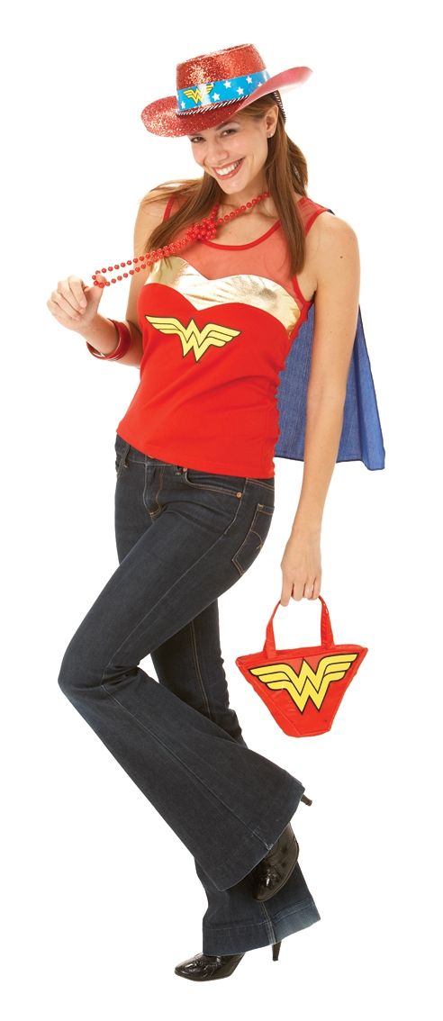 Топ Чудо-женщины выполнен в красном цвете с сетчатой вставкой, а также желтой эмблемой. К топу пришит синий короткий плащ-накидка.